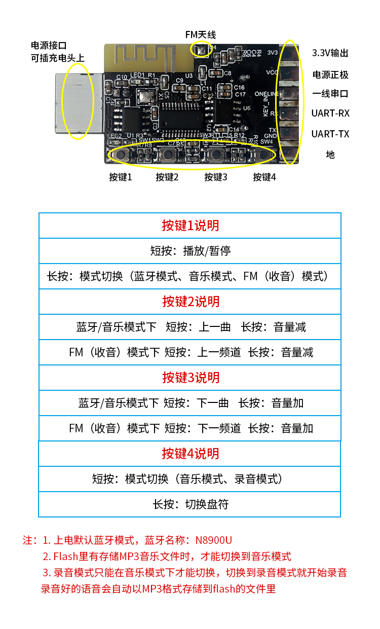 ★32位CPU+DSP 硬件解碼;★藍(lán)牙V5.0,USB2.0 OTG;★16位DAC立體聲輸出,SNR>90dB;★專用的 BUSY 信號輸出指示;★支持 30 級音量調(diào)節(jié),5種EQ調(diào)節(jié);★支持播放曲目序號獲取,總曲目及目錄總曲目等信息獲??;