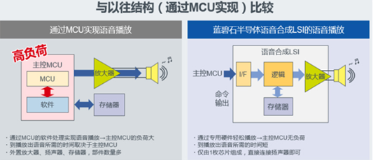 通過(guò)MCU實(shí)現(xiàn)語(yǔ)音播放需要外接很多的功能,比如說(shuō)外接主控MCU、放大器、存儲(chǔ)器等元器件,并且需要主控MCU的軟件支持。反觀LAPIS芯片,其把所有的零部件都內(nèi)置在芯片范圍內(nèi),不僅可以減輕主控MCU的負(fù)荷,也降低了由外部零部件發(fā)生錯(cuò)誤而產(chǎn)生的影響。“特別像現(xiàn)在車載市場(chǎng)上的新功能,如抬顯,主控MCU在工作時(shí)的負(fù)荷都是非常大的,以后車載上的功能越來(lái)越多的話,對(duì)主控MCU帶來(lái)的負(fù)荷也會(huì)越來(lái)越重。”姚玲玲說(shuō)到。