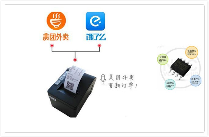 語音提示團(tuán)購?fù)赓u訂單,適合個(gè)體戶經(jīng)營的各類小餐館,甜品店,奶茶店。現(xiàn)如今,越來越多的個(gè)體經(jīng)營的餐館加入團(tuán)購?fù)赓u行業(yè)。這類店鋪往往只有2-3個(gè)人打理,考慮到人工和時(shí)間成本,不可能有專人坐在電腦前處理團(tuán)購?fù)赓u訂單。飯點(diǎn)一到,幾個(gè)人在店里忙的不可開交。等到閑下來時(shí),到電腦邊一看,發(fā)現(xiàn)錯(cuò)過了很多外賣訂單。加入語音功能的外賣打印機(jī)完美的解決了這個(gè)難題。不用專人守候,一有訂單,自動(dòng)搶單,并且語音播報(bào)芯片能夠及時(shí)告知店主,讓店主及時(shí)處理訂單。