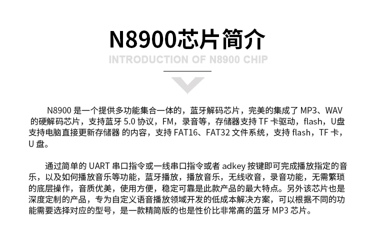 ★32位CPU+DSP 硬件解碼;★藍(lán)牙V5.0,USB2.0 OTG;★16位DAC立體聲輸出,SNR>90dB;★專用的 BUSY 信號輸出指示;★支持 30 級音量調(diào)節(jié),5種EQ調(diào)節(jié);★支持播放曲目序號獲取,總曲目及目錄總曲目等信息獲??;